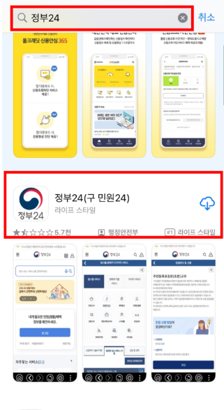 1. 스마트폰 앱스토어에서 "정부24" 어플 설치