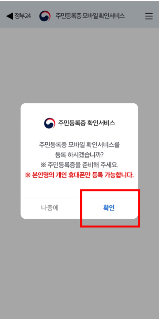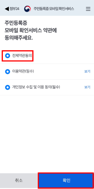 위에 안내해 드린 본인명의 휴대폰과, 주민등록증을 준비하셨으면 "확인" 버튼을 누른 후 정부 24 모바일신분증 등록을 위해 전체 약관동의를 해줍니다