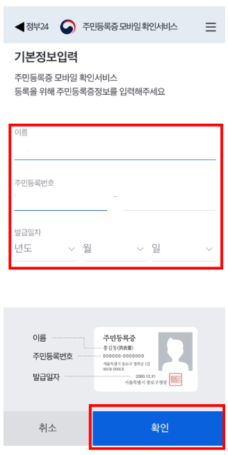 본인인증이 완료되면 기본정보입력을 하게 됩니다. 주민등록증에 적혀있는 데로, 이름, 주민등록번호, 주민등록증 하단에 적혀 있는 발급일자를 년, 월, 일 순서대로 선택한 다음 확인을 선택해 줍니다.