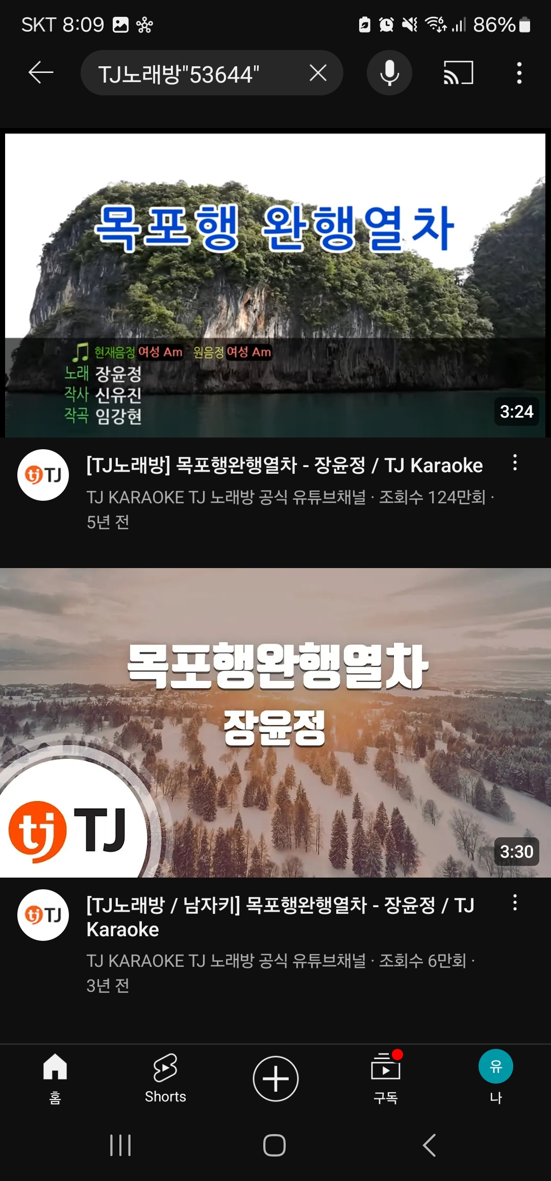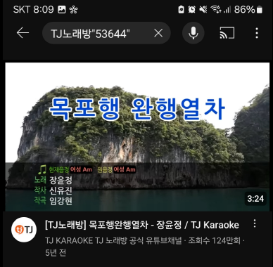 유튜브 검색창에 TJ 노래방 "53644"로 검색해도 되지만, 곡 번호를 알 수 없기 때문에 위 방법으로 노래 검색 후 유튜브 아이콘을 누르면 아래 화면처럼 바로 나와 노래를 부를 수 있습니다.